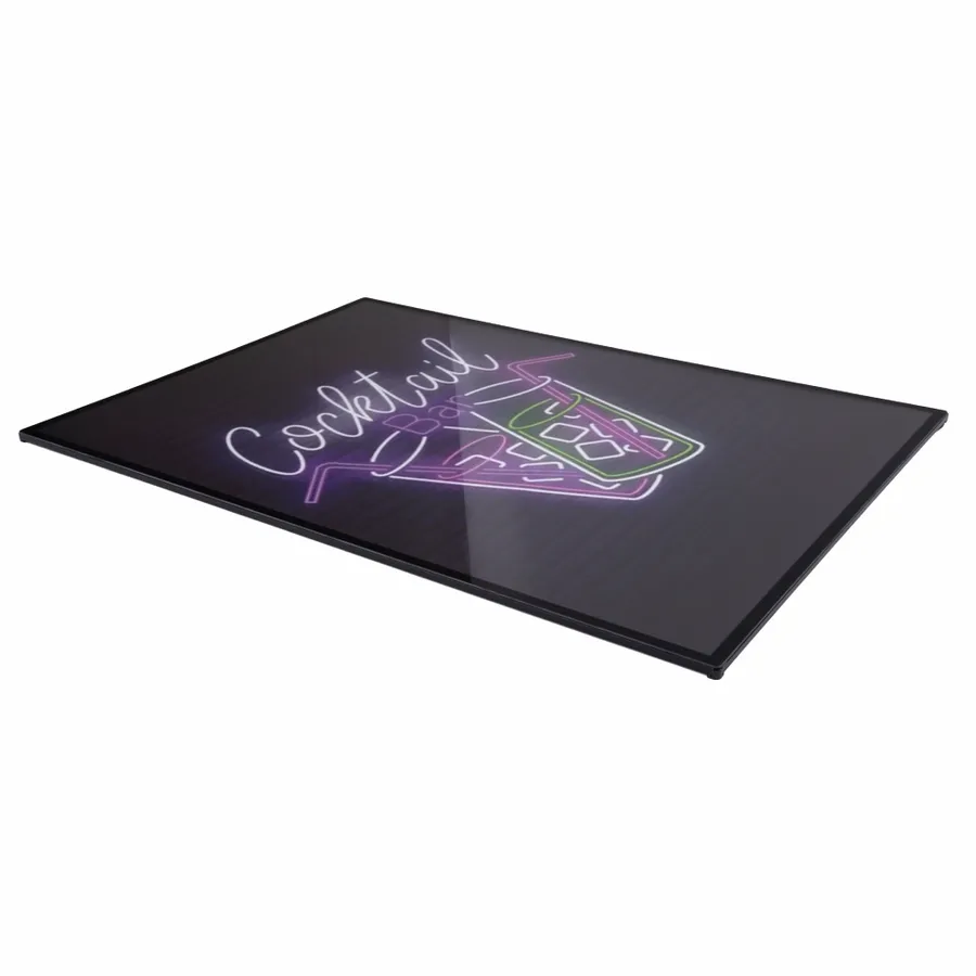 This slim aluminum-framed light box features a printed design illuminated by LED backlighting. With dark backgrounds and vibrant, neon-style artwork, it produces a glowing effect that closely mimics a traditional neon sign!