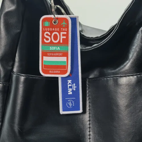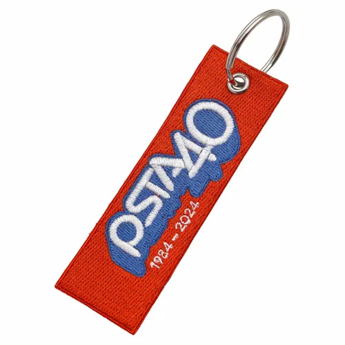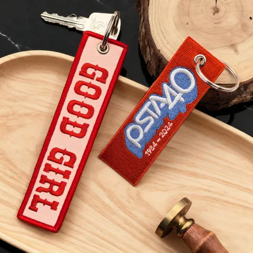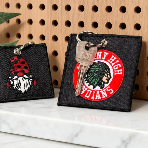 Here's the perfect keychain you are looking for. An Embroidered Patch on a keychain. The actual letters can be stitched in just about any color desired, Pick the colors and text that you want. Finished with Metal ring with eyelet and merrowed border. A maximum of 12 colors and you can choose the shapes that fit on your artwork.